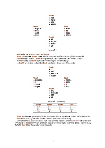 West นาไพดวย♠K South กน♠A แลวไล Trump สามรอบโดยเก็บใบใหญในมือ Dummy ไว