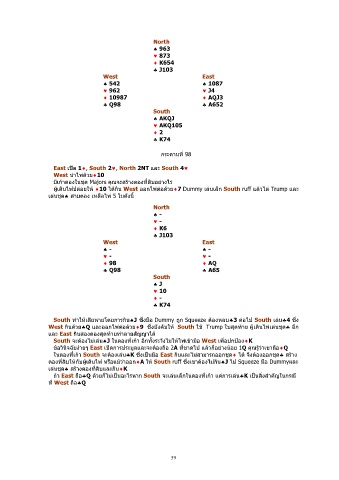 ในตองทีเกา South จะตองเลน♣K ซึงเปนมือ East กินและไมสามารถออกชุด♦ ได จึงตองออกชุด♣ สราง