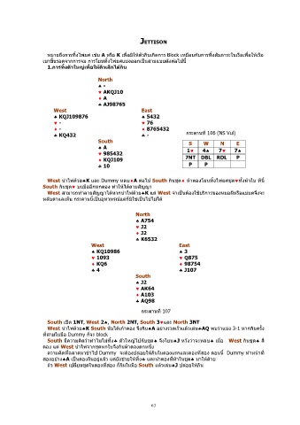 West นาไพดวย♠K และ Dummy หลบ♦A ตอไป South กนชุด♦ หาตองโยนทิงไพยศชุด♥ทังหาใบ ทีน ี ้